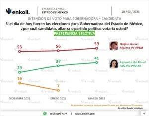 De acuerdo con los estudios más recientes, Enkoll, publicada el 29 de marzo por el diario El Universal, le da una ventaja de 18 puntos a Delfina Gómez, al registrar un 59 por ciento de intención de voto, por el 41 por ciento para Alejandra del Moral.