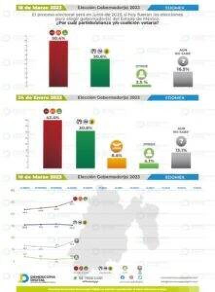 Respecto a la preferencia por partidos políticos, la intención de voto por Morena incrementó siete puntos en seis semanas. En la encuesta de Demoscopia Digital publicada el 10 de marzo, Morena tiene 50. 4 por ciento de intención del voto.