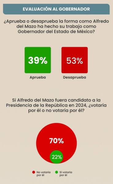 La encuesta también dio cuenta que 53 por ciento de los consultados desaprueba la forma como el gobernador Alfredo del Mazo ha trabajo en el Estado de México destacando que 67 por ciento de los consultados calificó como malo el combate al crimen organizado, 64 por ciento como malo el combate a la corrupción, 61 por ciento como malo las acciones de seguridad, 59 por ciento como mal la vialidad y 54 por ciento entre otros como malo la generación de empleos.