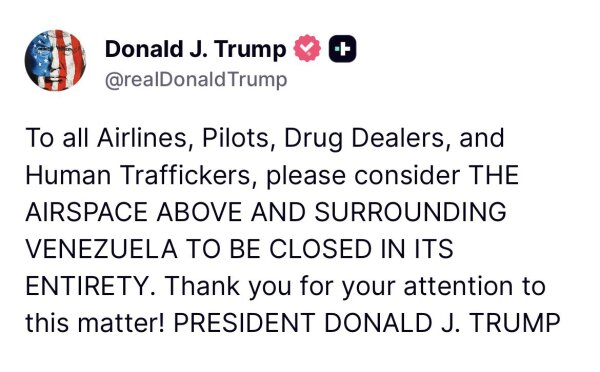 El presidente de Estados Unidos, Donald J. Trump, anunció este sábado que el espacio aéreo “sobre y alrededor de Venezuela” debe considerarse completamente cerrado. El mensaje fue emitido a través de su red social, donde advirtió a “aerolíneas, pilotos, narcotraficantes y traficantes de personas” que la zona no debe ser sobrevolada. Aunque el anuncio generó un impacto inmediato en la región, el mandatario no ofreció detalles sobre los mecanismos con los que su gobierno planea hacer cumplir esta directriz.