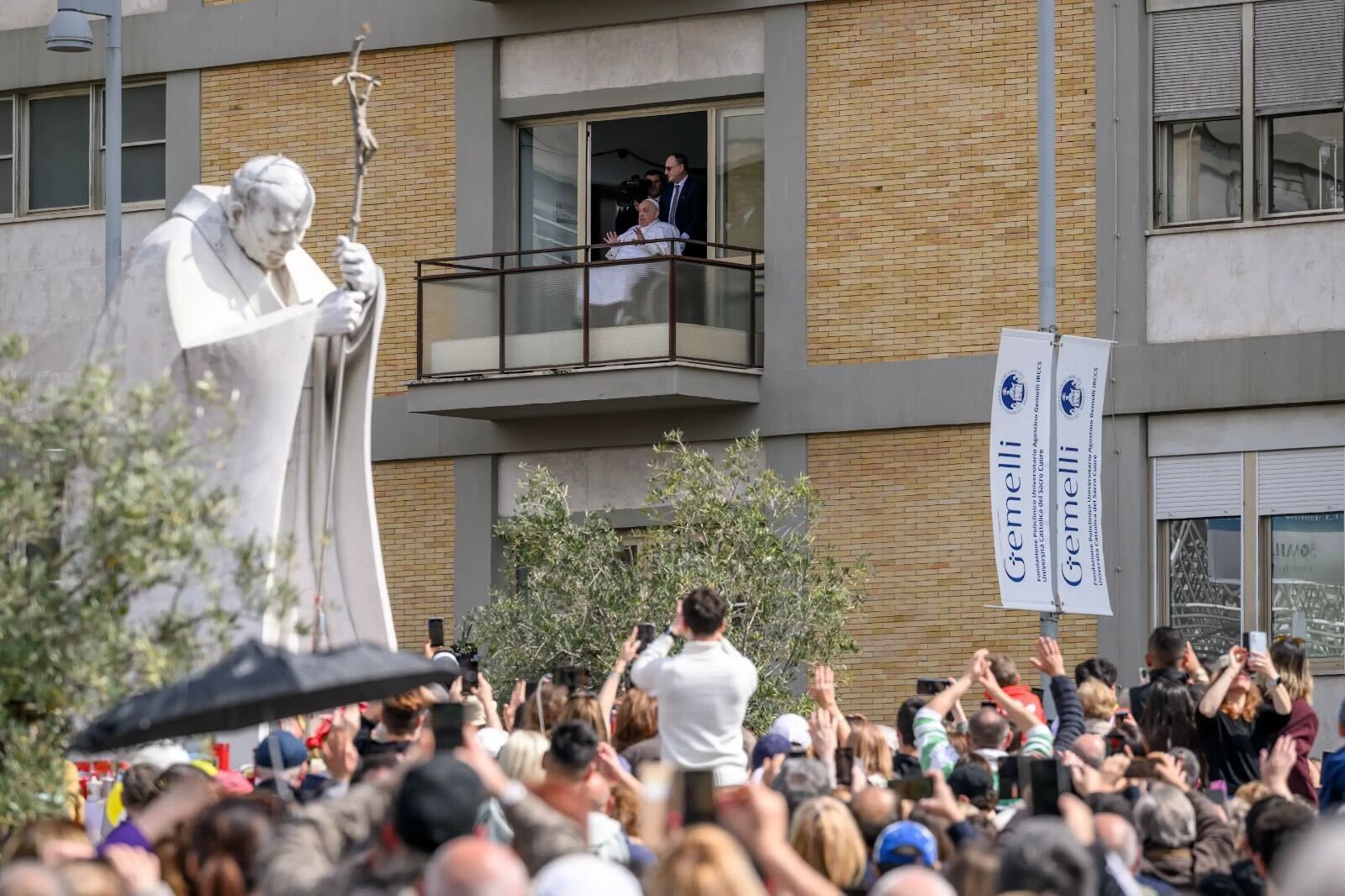 Aunque el Papa parecía frágil y le costaba hablar, se dirigió a la multitud afuera del hospital, agradeciéndoles y reconociendo a una mujer que sostenía flores. También dio una bendición, aunque parecía tener algunas dificultades para levantar los brazos.